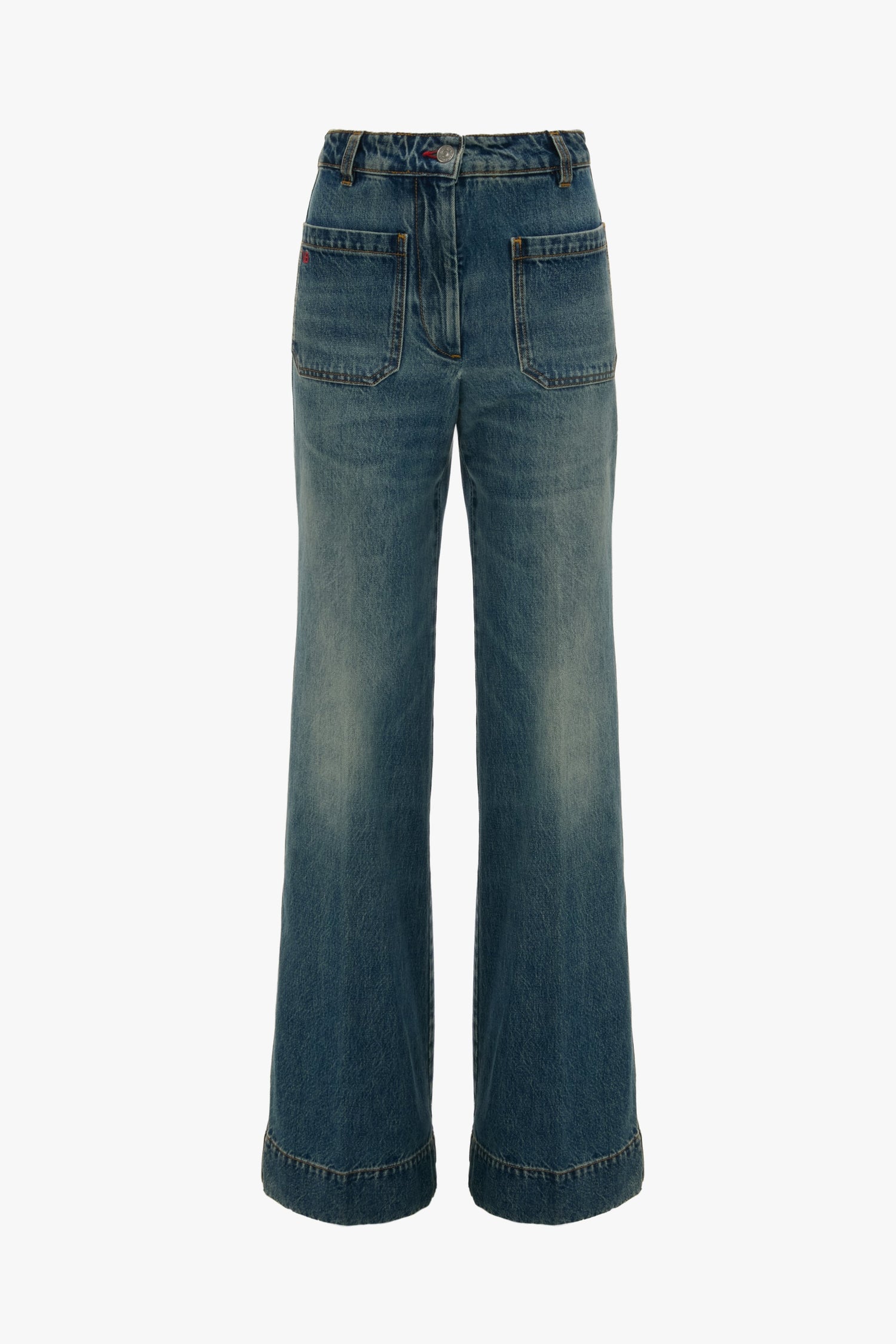 Crafted from a non-stretch, mid-weight denim and presented in this Classic Blue Wash, the house’s signature Alina Jean is a refined reimagining of a utilitarian staple. A high-rise waist and flared leg create a figure-flattering silhouette, while front and back patch pockets add retro appeal. A Victoria Beckham embroidered monogram completes the look.