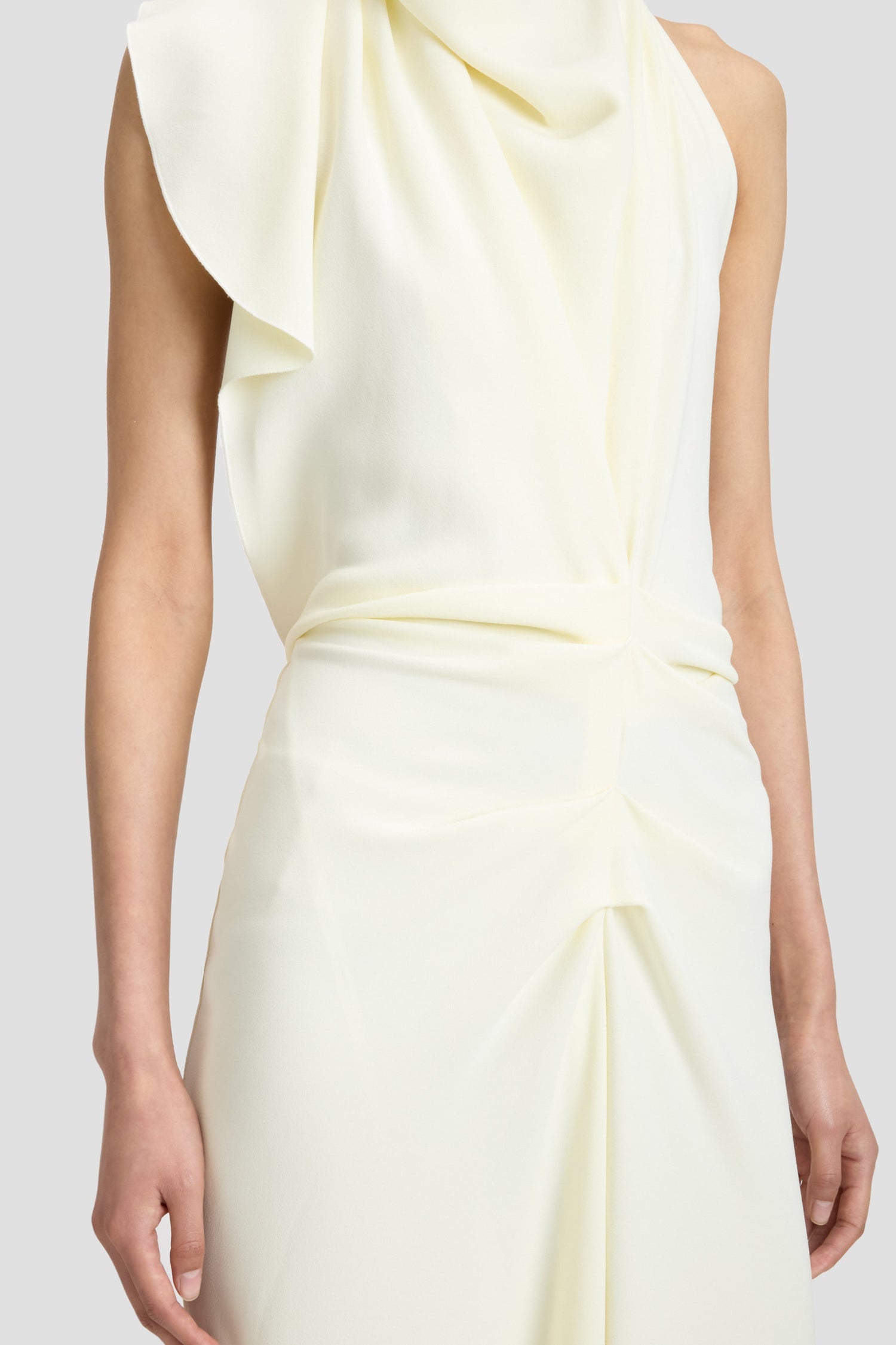 Understated elegance meets fluid movement in the Backless Scarf Detail Midi . Designed with a refined halter neckline, this piece features a front pleat and drape detail that creates a sculptural silhouette. The soft folds of satin crepe cascade effortlessly, while subtle gathering at the waist enhances the shape.