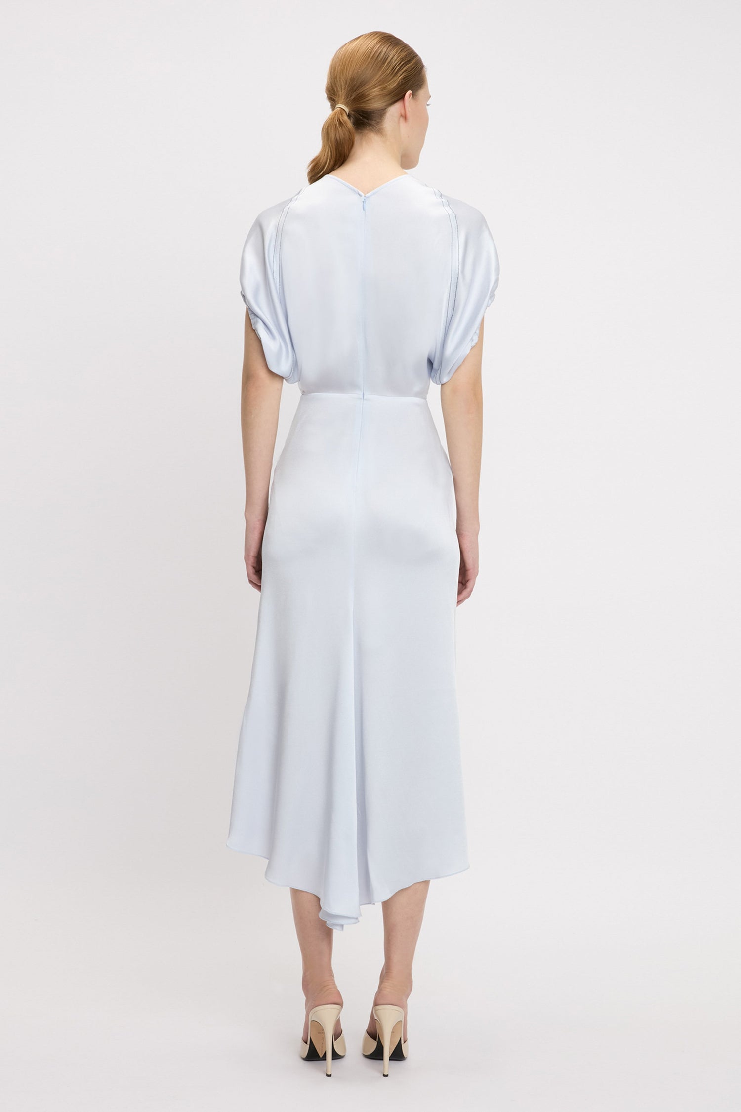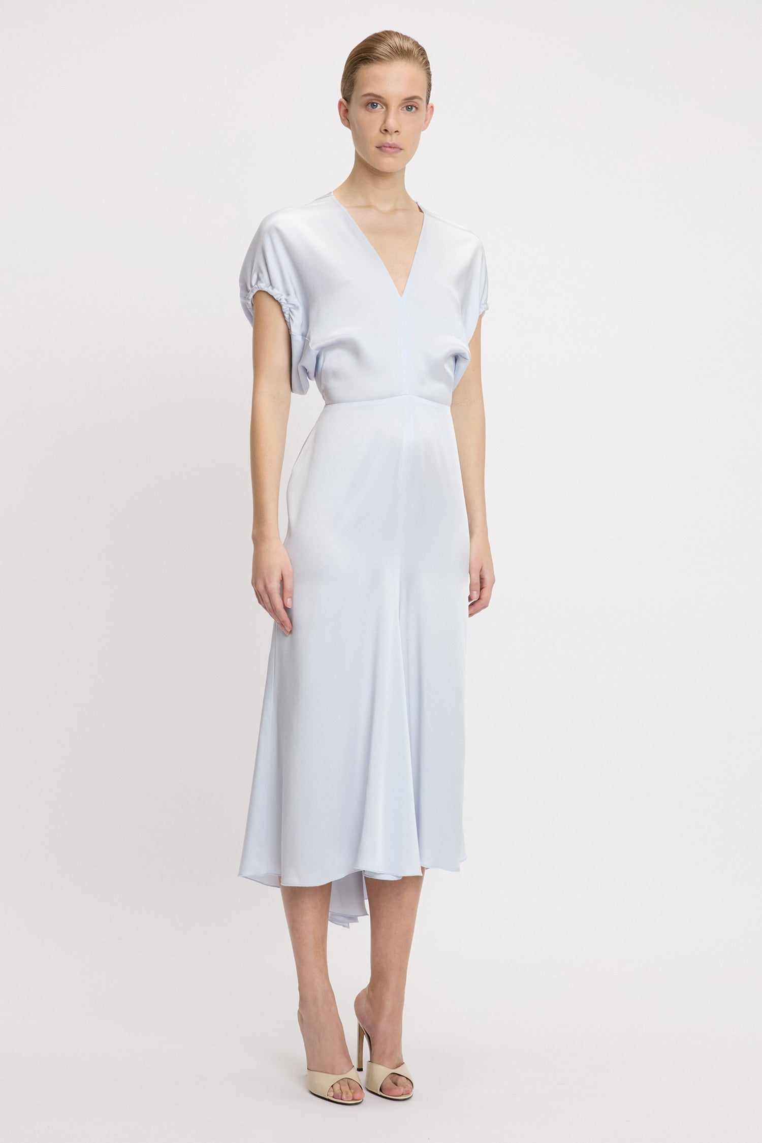 Midi dresses are part of the Victoria Beckham brand DNA and this season’s Blouson Detail Midi Dress is characterised by short full sleeves with directional rope edging. A front V neckline with internal binding adds a discrete design detail while a longer-length hemline at the back adds fluidity to the silhouette. The serene shade of Ice looks effortlessly elegant.