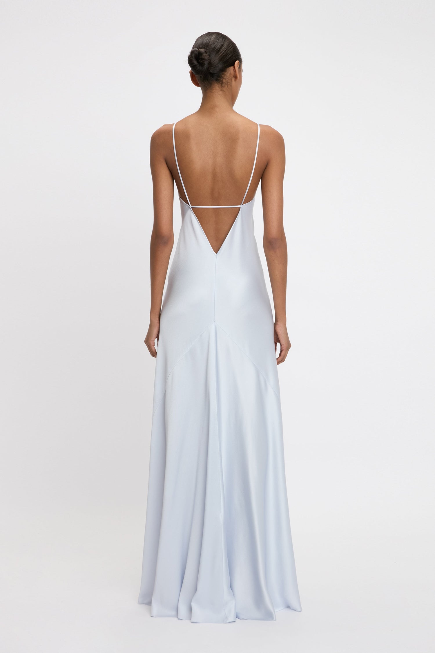Referencing Victoria’s favourite style decade, this 1990s-inspired camisole-slip dress is crafted from fluid crepe back satin for a sensual lightweight feel. Cut on the bias for a figure-flattering drape, it has a scooped deep-V at the back with horizontal strap for a provocative point of interest and a godet insert and mini train. Presented in a subdued shade of Ice, it deftly reimagines nineties retro glamour.