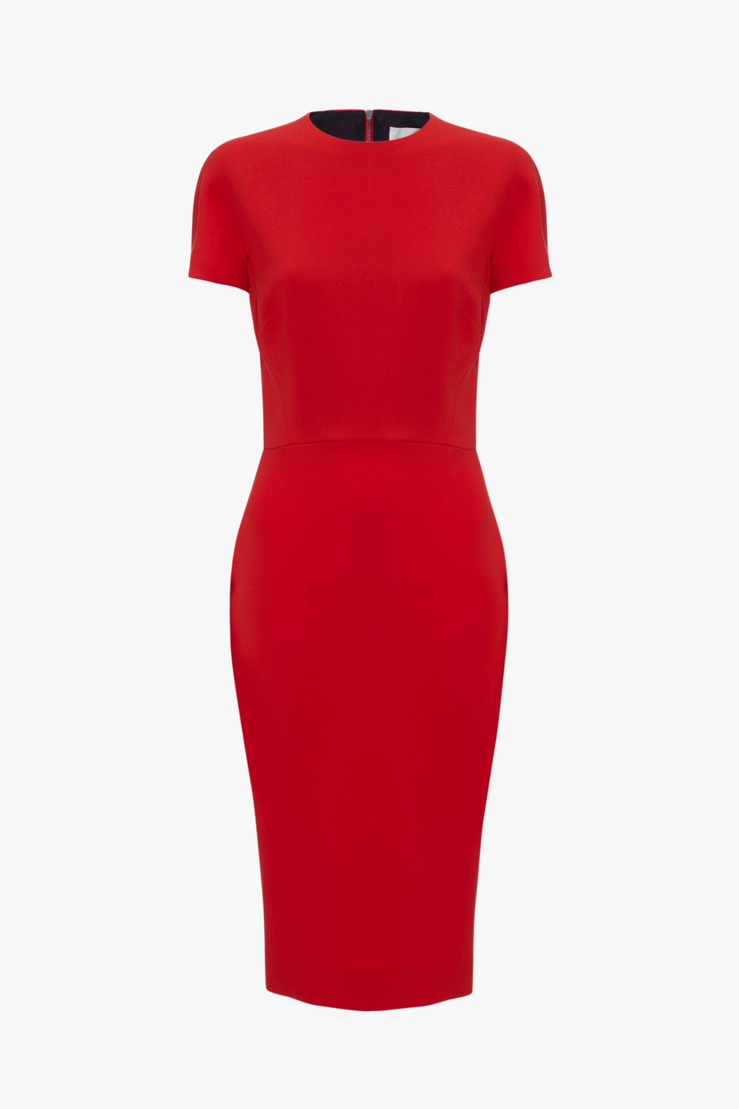With a modest round neckline, short sleeves and a midi-length hem, this signature Fitted T-shirt Dress has an understated sophistication. Dart details create a defined waistline, while double-ended exposed metal zips to the back add a contemporary design feature. Style simply with the Pointy Toe Stiletto Sandal and the Mini Chain Pouch.