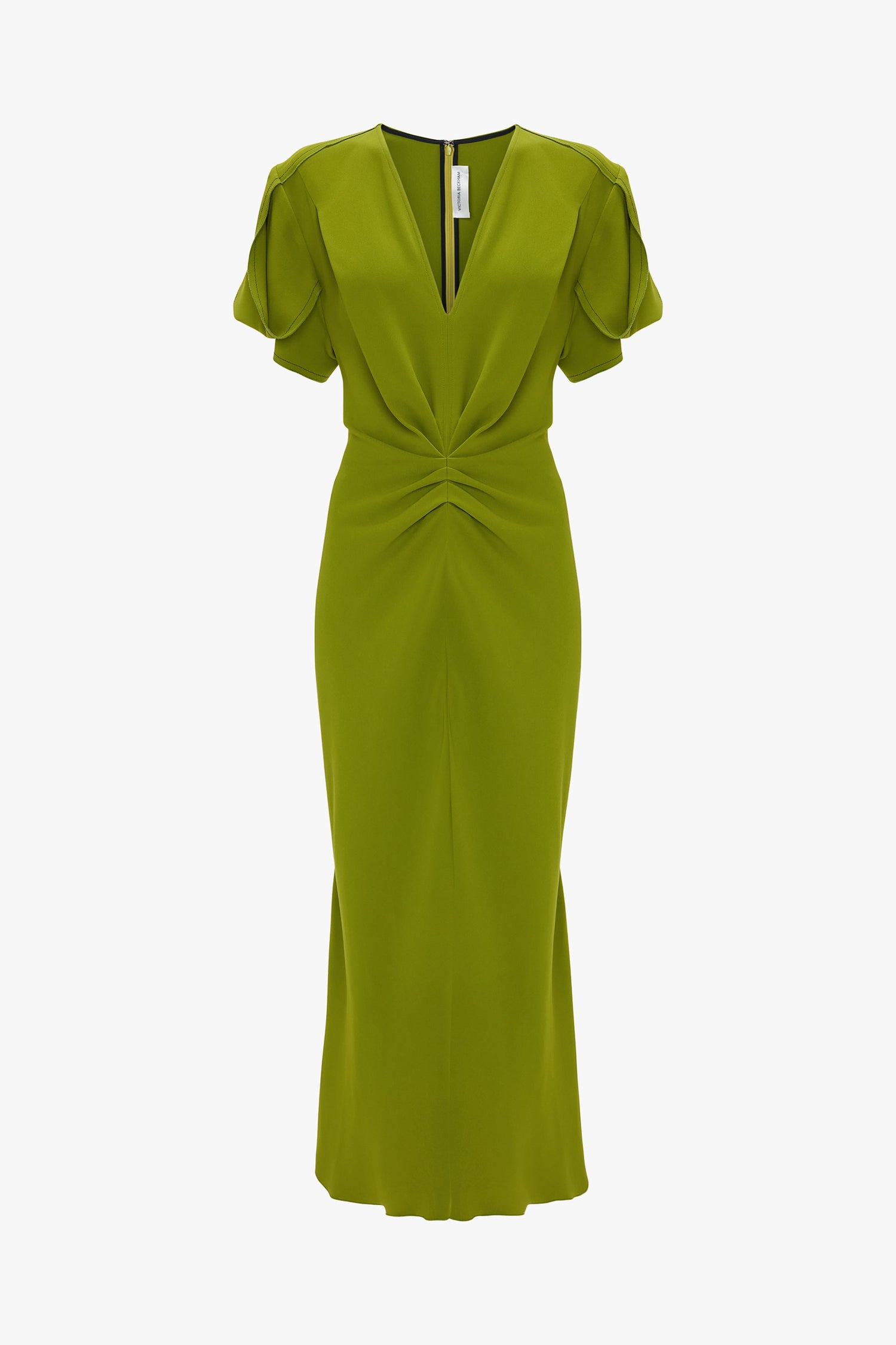 Presented in a new-season shade of Parakeet, the Gathered V-Neck Midi Dress is shaped at the waistline with a more relaxed fit through the bodice for a laidback but luxe silhouette. Pleat details at the front waist and shoulders add texture, while hard press details through the skirt and back shoulder introduce subtle structure. Discreet design details include exposed seams, a contrasting topstitch and a longer-length hemline at the back.