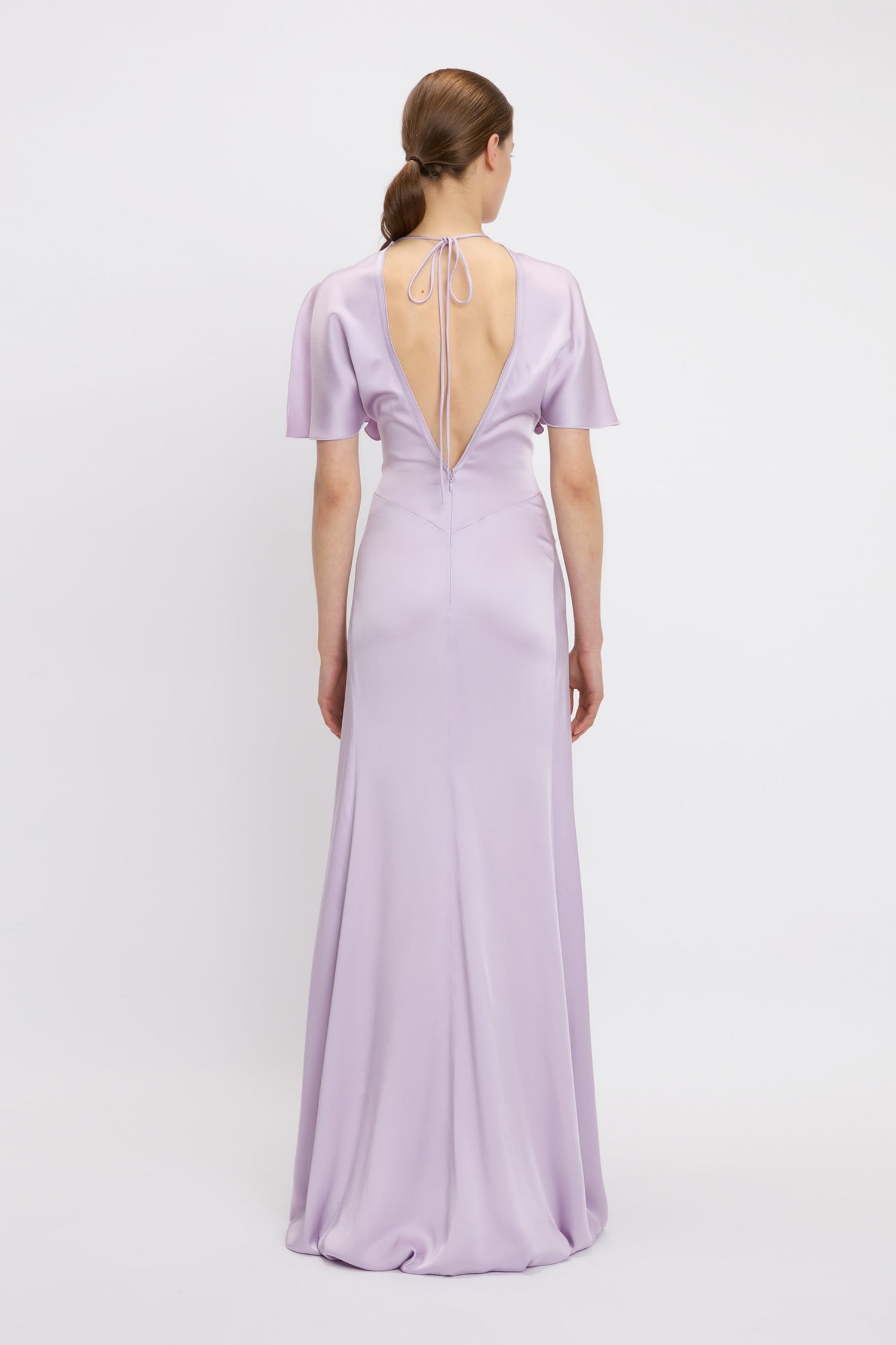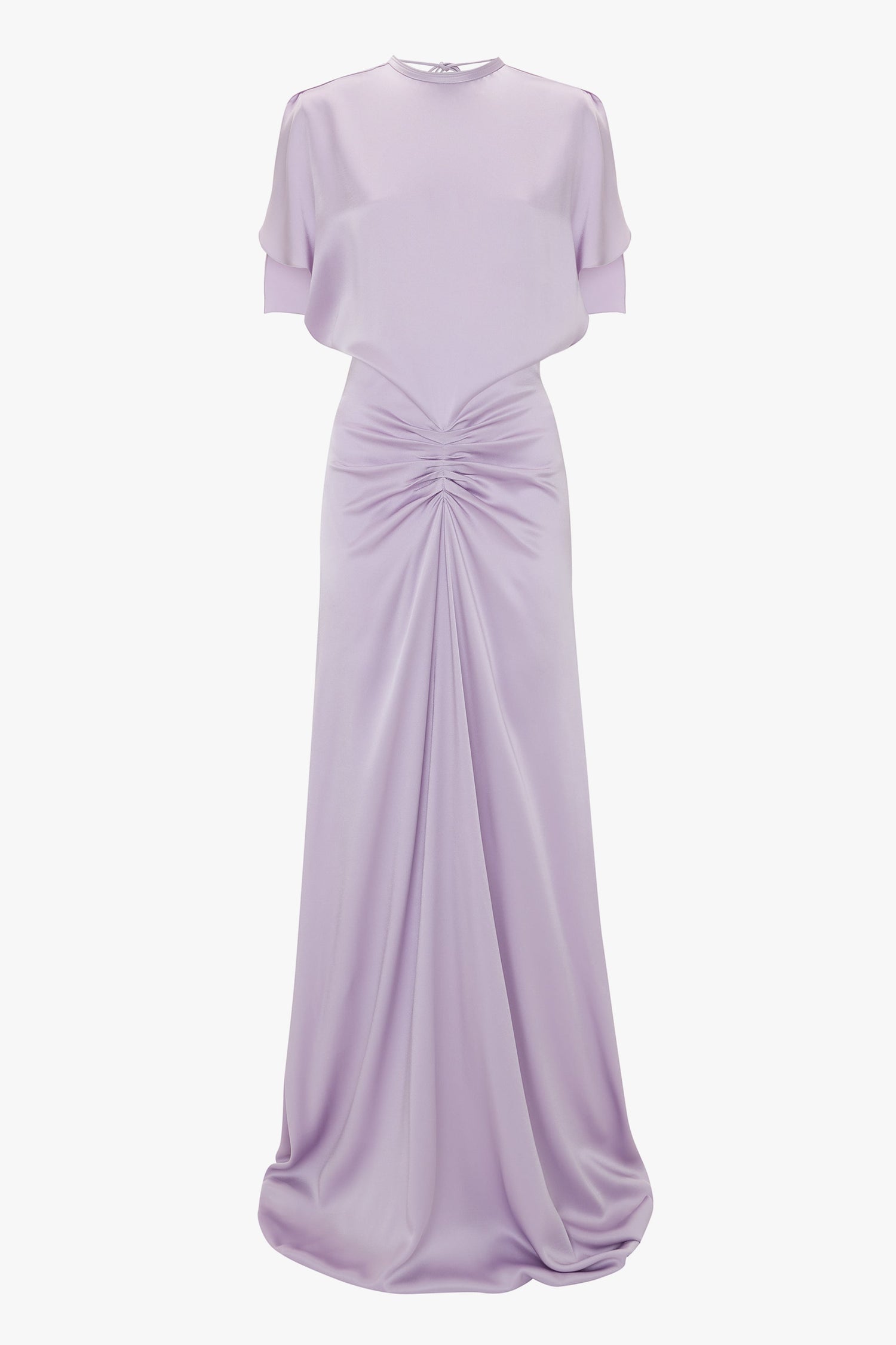 A demure front neckline and floor-pooling hemline playfully contrast with the seductive open-back design of the Gathered Waist Floor-Length Dress. Presented in pretty Petunia, it is crafted from luxurious crepe back satin and is fitted at the waist and hip for a gentle hourglass silhouette. Elevated design details include tactile pleating at the skirt, asymmetric sleeves and an elegant tie detail at the back of the neck. Exposed seams and a contrasting topstitch add attractive talking points.