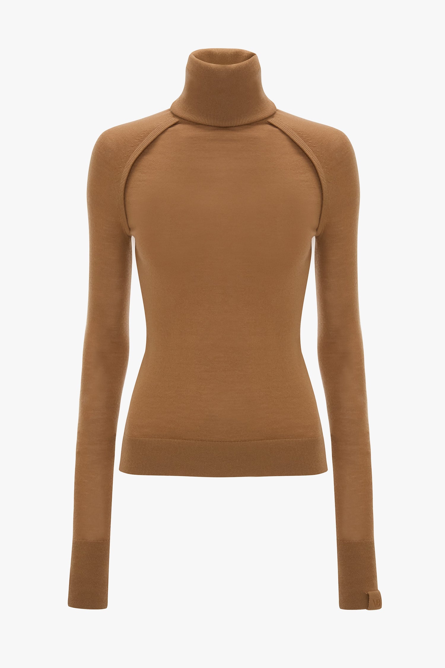 Crafted from 100% merino wool, the High Neck Top has a slim cut, roll-neck design and longer-length sleeves with thumb holes for a figure-defining silhouette. Ribbed trims along raglan shoulders add texture and definition, while a branded embroidered tab at the cuff adds an elevated point of difference. Presented in versatile Camel, it is a sophisticated wardrobe basic.