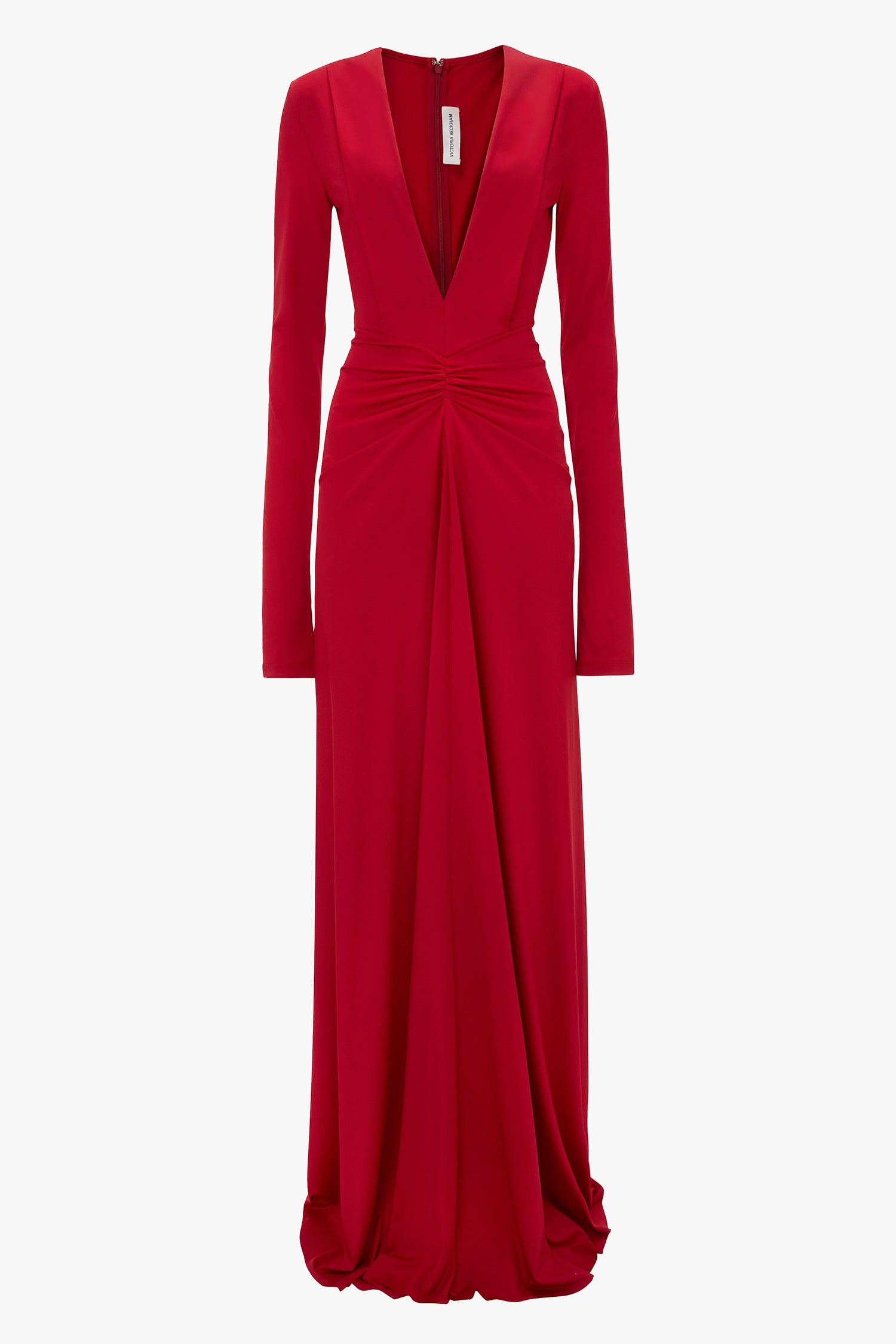 A plunging neckline and floor-pooling hemline imbue the Long Sleeve Deep V-Neck Gown with an elongating silhouette. Crafted from stretch jersey for a body-skulpting effect, it has refined long sleeves, a V-shape waist seam and tactile front ruching. Presented in tender Rose, it is expressive but understated and perfectly reflects the house’s contemporary flair.
