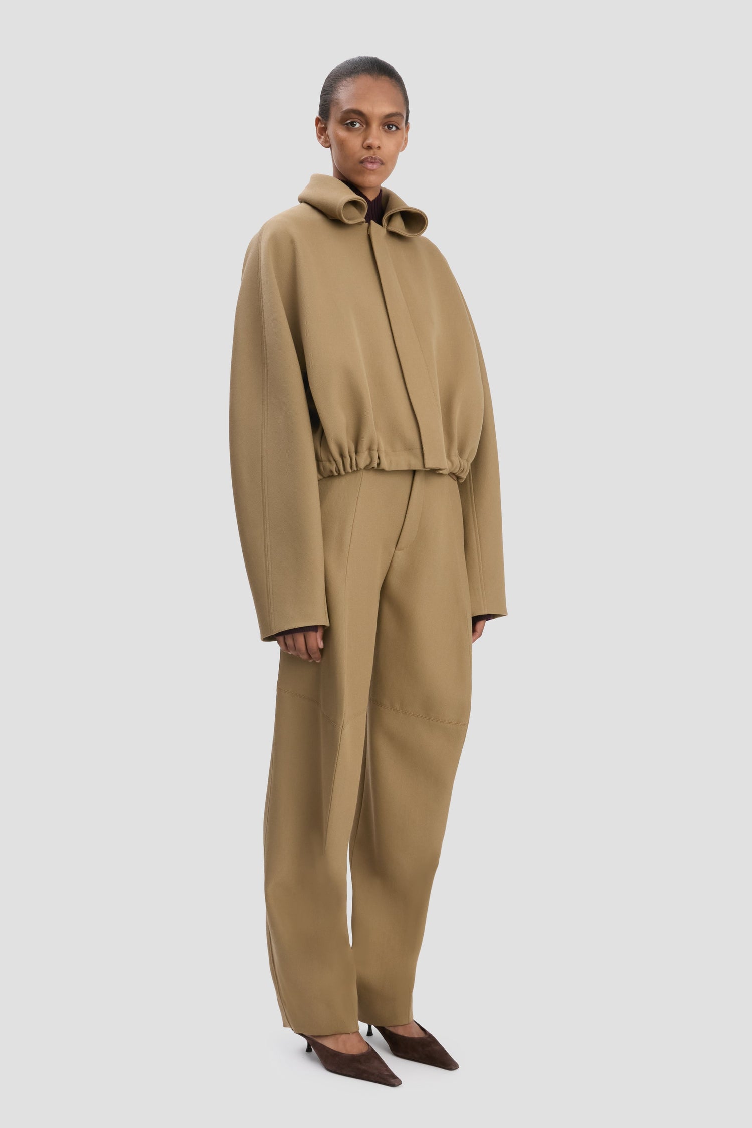 A runway highlight, the Oversized Roll Neck Bomber Jacket is characterised by this season’s signature roll-neck design. A sculptural feature, it creates a contemporary contrast with the otherwise relaxed, oversized silhouette, while its softly rounded edges bring a feminine sensibility to the look. Crafted from a heavy gabardine, it has a hip-length hemline, side-seam pockets and an elasticated waistband.