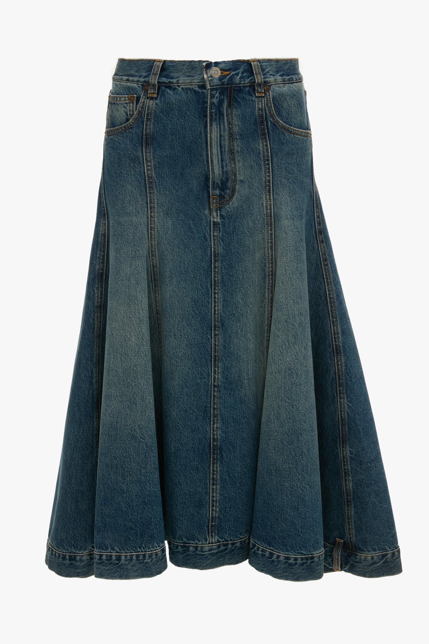 Panelled Kick Detail Skirt In Classic Blue Wash