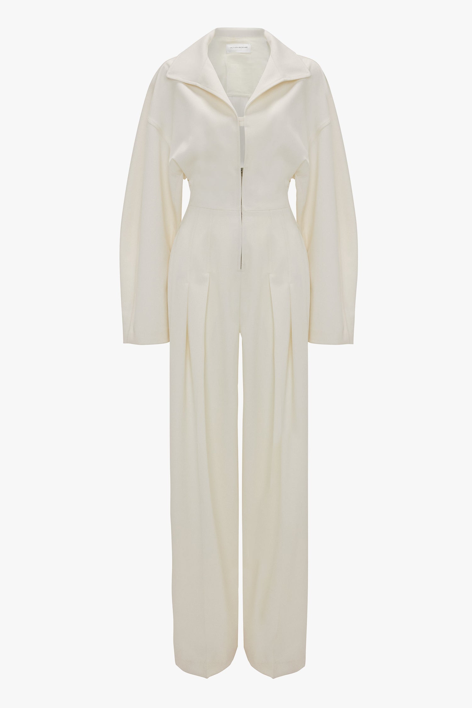 Laid-back luxury is the hallmark of the Tab Detail Jumpsuit. Crafted from a wool blend in Ivory, it has a V neckline, an elasticated waist at the back and wide legs with pleats. Visible hardware, including a front metal zip and back yoke detail, references its utilitarian roots, while a deep collar adds a polished point of difference. Side pockets and back welt pockets complete the look.