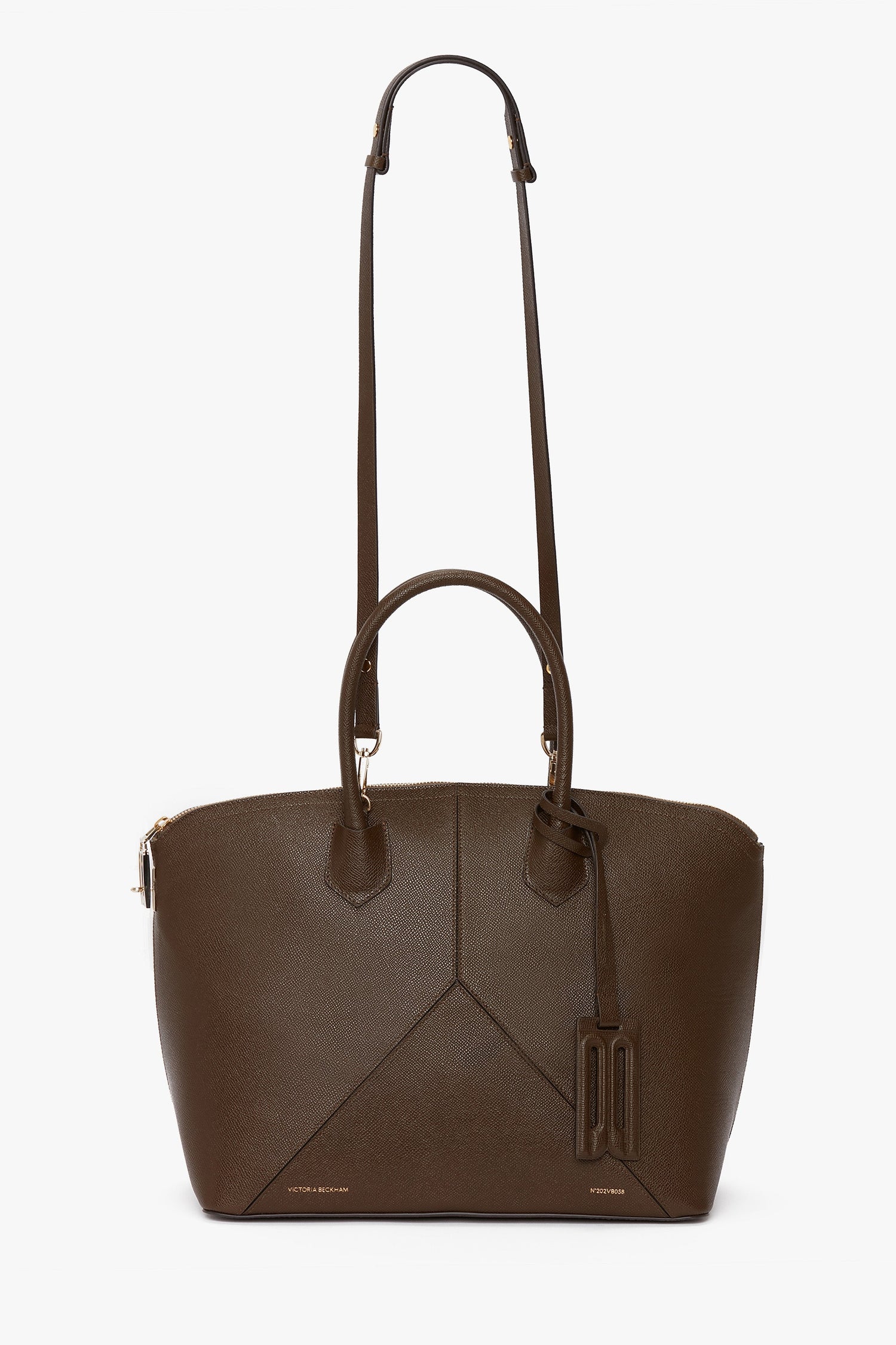 Refined and versatile, The Victoria Bag in Khaki, crafted in Italy from a textured calf leather, embodies the house’s penchant for practical but polished accessories. A removable ‘smart strap’ with snap buttons allows the bag to be worn as a shoulder or crossbody, while top handles and a generous volume ensure absolute convenience. The house’s signature design feature of leather panels stitched to form a V shape adds visual interest, while the discretely stamped address of Victoria’s London studio (N.202) followed by a unique serial number elevates the look further. Additional design features include an engraved B zip puller and padlock closure, snap button to hold the zip tape in place, textile lining and a flat internal pocket.