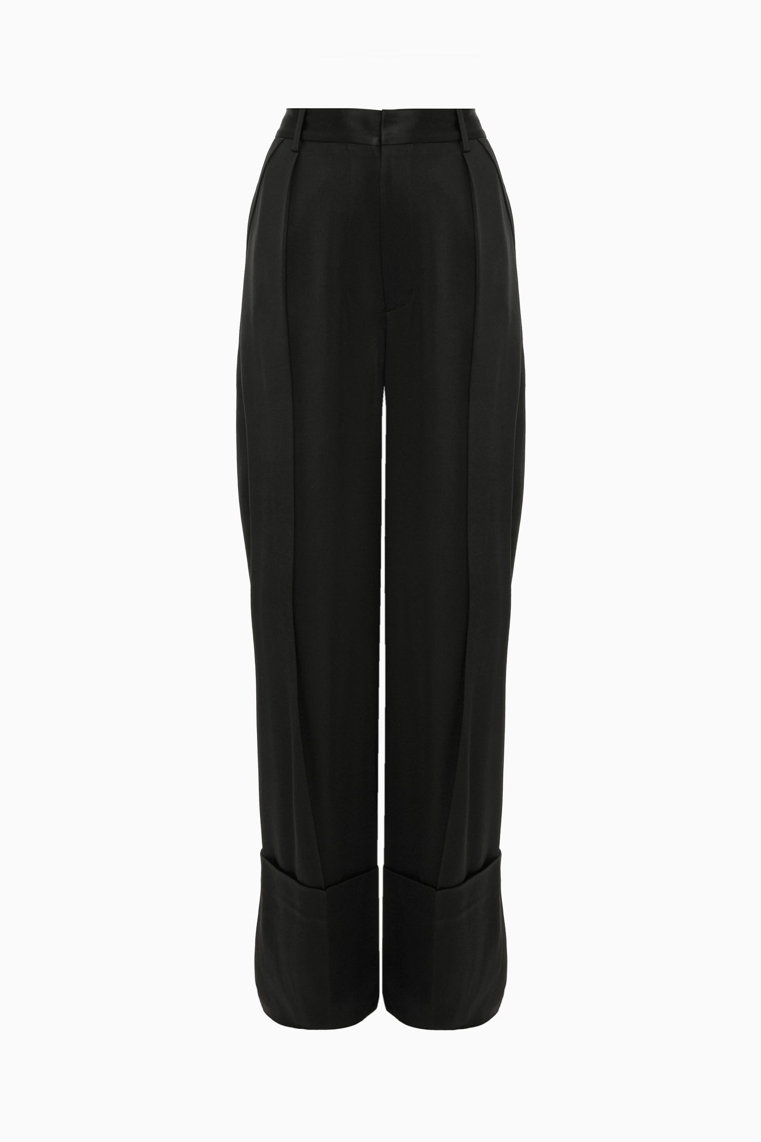 A contemporary take on traditional tailoring, the Wide Leg Turn-Up Trouser in Black is crafted from fluid crepe back satin for a feminine sensibility. Designed with a flattering high-rise waist, it falls into a wide-leg silhouette and is accentuated by front pleats and deep turned-up hems. Casually sophisticated, the Wide Leg Turn-Up Trouser exudes modern glamour.
